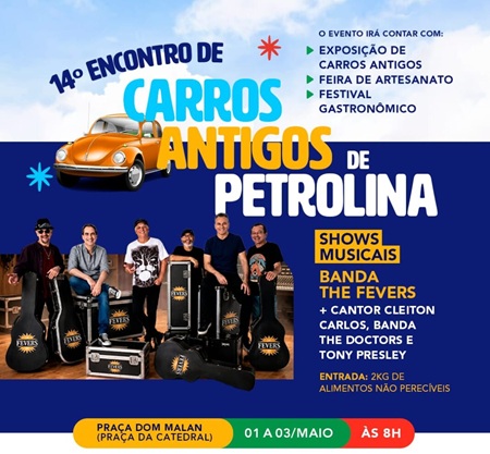 A cidade de Petrolina sedia entre esta sexta-feira, 1° de maio, e domingo, 3, o ‘14° Encontro de Carros Antigos’. O evento conta com exposição de veículos, Feira de Artesanato, Festival Gastronômico e apresentações artísticas.