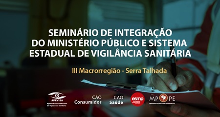O Ministério Público de Pernambuco (MPPE), em parceria com a Agência Pernambucana de Vigilância Sanitária (Apevisa), realiza nos dias 28 e 29 de agosto, em Serra Talhada, o “Seminário de Integração do MPPE e Sistema Estadual de Vigilância Sanitária” da III Macrorregião. A ação envolve os centros de Apoio Operacional de Defesa da Saúde (CAO Saúde) e do Consumidor (CAO Consumidor) e a Escola Superior do Ministério Público (ESMP).