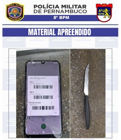Os policiais anotaram todas as características do acusado e saíram em busca dele. No momento que foi localizado, o suspeito tentou se desfazer de um celular da mesma marca da vítima, mas os policiais conseguiram apreendê-lo. O indivíduo estava acompanhado de outro homem, que portava uma faca.