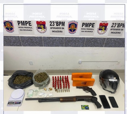 Após buscas no local, os policiais encontraram um revólver calibre 38, 2,975 kg de maconha, 51 gramas de crack, 72 gramas de cocaína, munições, celulares e balança de precisão.