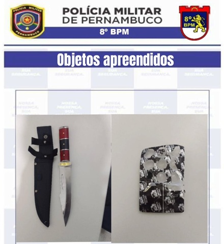 No momento da abordagem, os PMs descobriram que o homem portava uma faca na cintura e uma cartela de rebite, um medicamente à base de anfetamina, de uso controlado, utilizado ilegalmente como droga estimulante. Por conta disso, ele foi conduzido à Delegacia de Polícia Civil da cidade e submetido a um Termo Circunstanciado de Ocorrência (TCO).