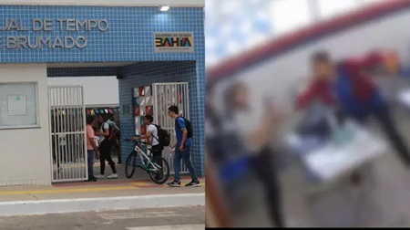 Uma professora levou um tapa no rosto de um aluno durante uma aula no Colégio Estadual em Tempo Integral de Brumado, no sudoeste da Bahia, na última terça-feira, 8. A agressão foi registrada por uma câmera de segurança. No vídeo, os alunos estão sentados nas carteiras, quando um adolescente, de 17 anos, vai até a professora e dá um tapa no rosto dela.