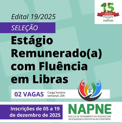 O Campus Ouricuri do IFSertãoPE abriu inscrições para processo seletivo simplificado, com duas vagas de estágio remunerado com fluência em Língua Brasileira de Sinais (Libras). Os estudantes selecionados vão atuar na tradução e interpretação de Libras, em uma experiência prática alinhada à formação acadêmica. Interessados podem se inscreve gratuitamente por meio deste formulário eletrônico até o dia 19 de dezembro.