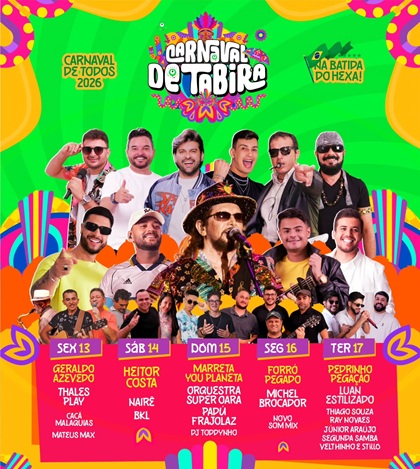 Localizado no Sertão do Pajeú, o município Tabira divulgou uma das melhores programações de Carnaval da região. O evento, que começa nesta sexta-feira, 13, e segue até o dia 17, tem shows confirmados de Heitor Costa, Pedrinho Pegação, Geraldo Azevedo e Marreta You Planeta.