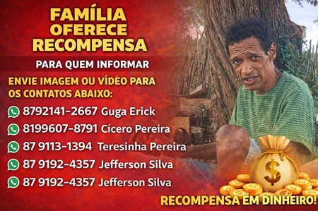Nino desapareceu no Sítio Algodões, na zona rural de Verdejante, mas é natural de Salgueiro e morou por muito anos no bairro Divino Espírito Santo, onde é bastante conhecido. Ele sofre de problemas mentais, o que aumenta a preocupação e angústia da família e amigos.