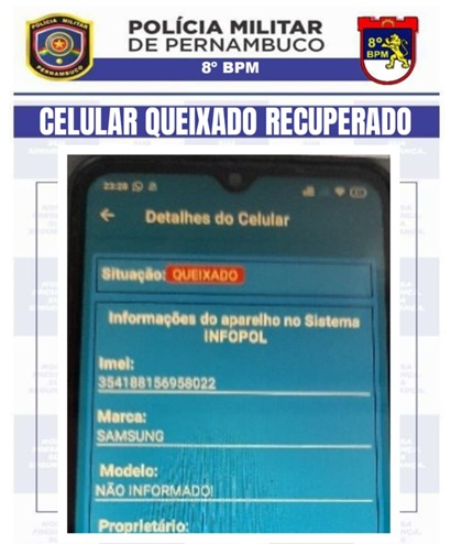 Na noite deste domingo, 29, por volta das 22h39, policiais militares do 8° BPM apreenderam um celular com queixa de perda ou furto na Rua Poeta Levino Neto, no bairro Nossa Senhora Aparecida, em Salgueiro.