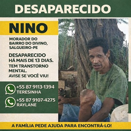 Fazendo todos os esforços para encontrá-lo, familiares reclamam da falta de empenho das autoridades de segurança. “A única providência adotada pela Polícia Civil foi o registro do Boletim de Ocorrência nº 26E0283000081, na DEPOL de Salgueiro-PE. A família foi informada de que não haveria outras medidas, sob a justificativa de se tratar apenas de um caso de desaparecimento”, relata Cícero Pereira, parente de Nino, em nota divulgada nesta sexta-feira, 16.