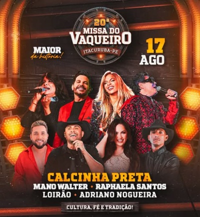 O perfil oficial da Missa do Vaqueiro de Itacuruba no Instagram divulgou nesta quarta-feira, 6, a grade artística da 20ª edição do evento, agendado para o dia 17 de agosto.