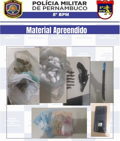 Na residência os policiais encontraram uma arma de fogo calibre 38 com 17 munições intactas, um simulacro de pistola, um facão, um aparelho celular Samsung, uma balança de precisão, cerca de 27 gramas de maconha e 61 de cocaína, R$ 510 em espécie e embalagens plásticas usadas para o acondicionamento de drogas.