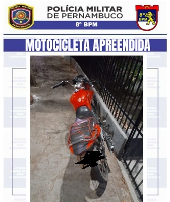 Policiais militares do 8° BPM apreenderam na noite deste domingo, 28, uma moto Honda CG 150, cor vermelho, com sinais de adulteração, que tinha sido usada em uma tentativa de homicídio na mesma noite no bairro Divino Espírito Santo, em Salgueiro.