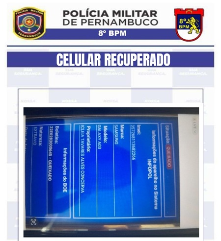 Um celular com queixa de extravio foi apreendido por policiais militares do 8° BPM na tarde desta segunda-feira, 14, na Travessa Alfredo Soares, no bairro Divino Espírito Santo, em Salgueiro.