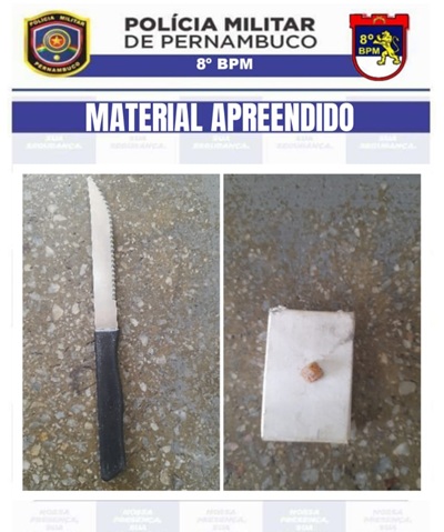 Chegando ao local, os policiais fizeram a abordagem dos denunciados e constataram eles poderiam colocar em risco a segurança dos cidadãos da referida rua. Com o homem foi encontrada uma faca e com a mulher e pequena pedra de crack.