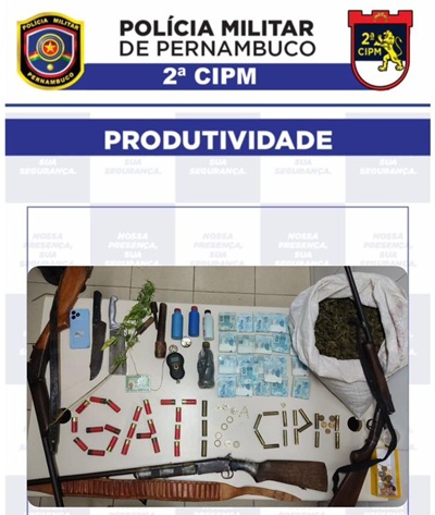 A ação foi concluída com a apreensão de 3,5 kg de maconha pronta para o consumo, 36 cartuchos de calibres variados, três espingardas de calibres 12, 32 e 20, três fracos com chumbo, um frasco com pólvora e a quantia de R$ 22.014,75 em dinheiro.