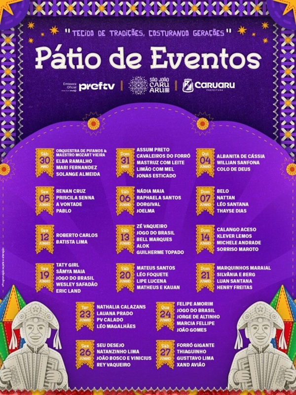 O São João de Caruaru 2026 teve a programação completa divulgada nesta quinta-feira (19). Este ano, a abertura do evento será no dia 10 de abril com a caravana do São João na Roça, no distrito de Lajes, Zona Rural de Caruaru, no Agreste de Pernambuco. Ao todo 27 polos de animação estarão espalhados pela área urbana e rural da cidade.